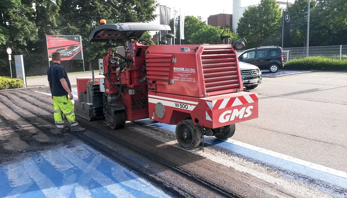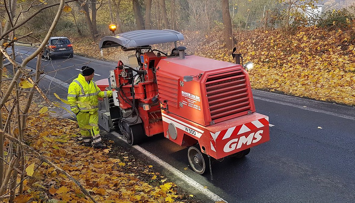 Das Twister-System von GMS ermöglicht kantenloses Feinfräsen. Damit beseitigen wir Fahrbahnmarkierungen aller Art auf Asphalt und Beton. Großer Vorteil der Demarkierung mit dem Road-Twister®-System: Im Gegensatz zu vielen anderen Systemen entsteht keine Phantomwirkung der alten Markierung bei Nacht oder Nässe.